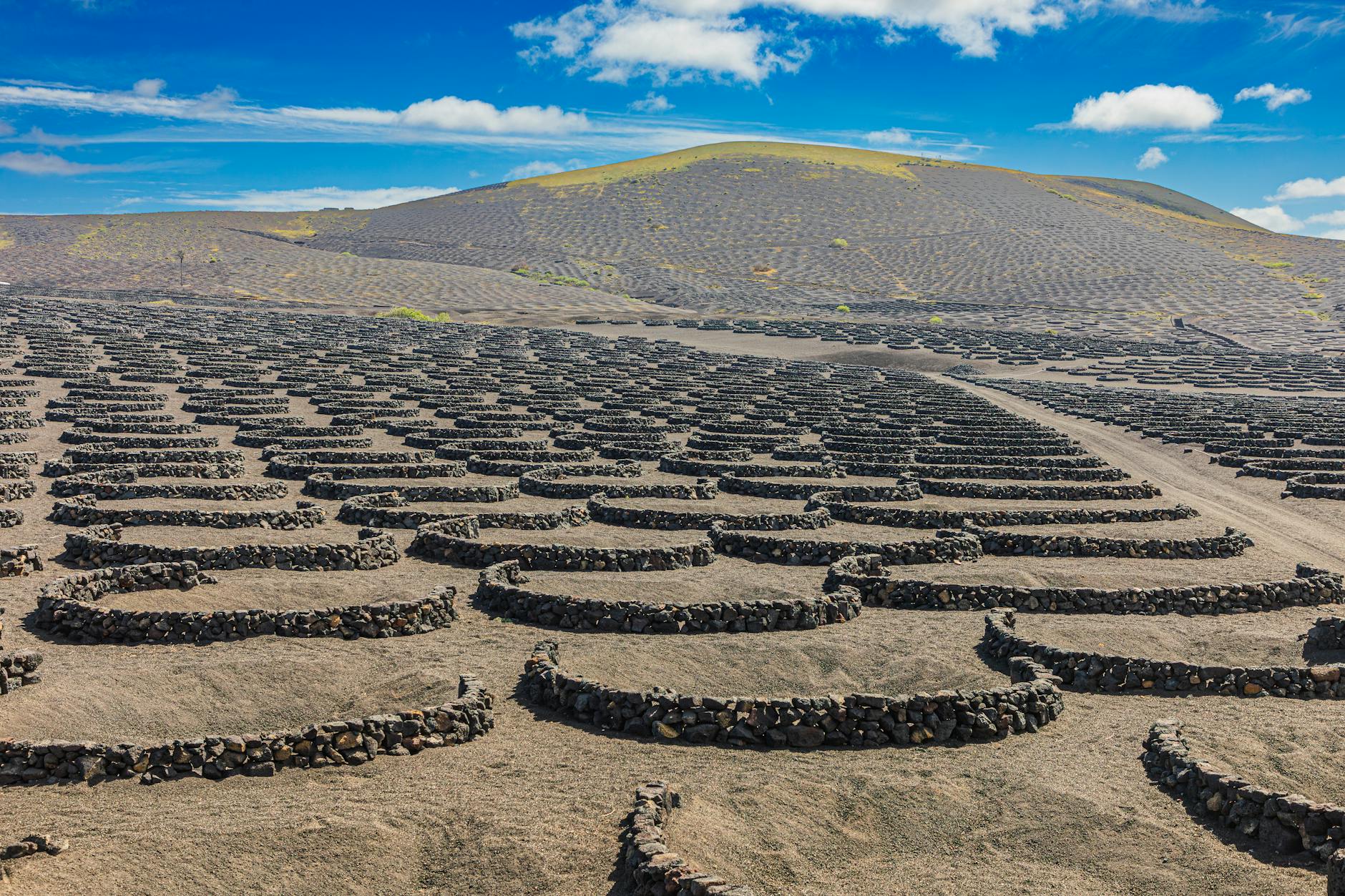 The one section of the island that looks more improbable in person than in photographs. Over five thousand hectares of black volcanic ash, stretching along the LZ-30 from Masdache to Uga, have been dug out into semicircular or conical pits — hoyos — each about three metres across and up to two and a half metres deep, with a single old vine at the bottom of each pit and a crescent-shaped dry-lava-rock wind-wall — a zoco — built on the upwind side. The pits are dug down to reach the pre-eruption agricultural soil below the 1730–36 picón deposit; the picón itself, which buried everything at a stroke, turned out (by trial and error in the decades after the eruption) to be an almost perfect moisture sponge for a landscape that receives less than a hundred and fifty millimetres of rain a year. Dew condenses on the lapilli at night and drains down to the vine roots. Everything from digging to harvest is done by hand. The region was recognised by the UN FAO as a Globally Important Agricultural Heritage System in the 1990s.